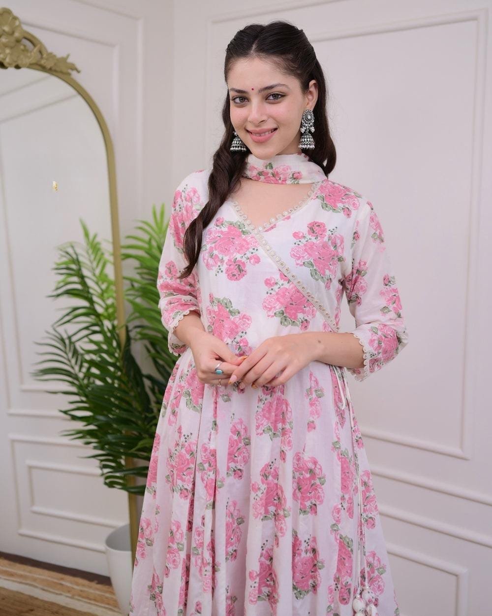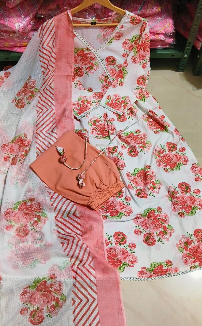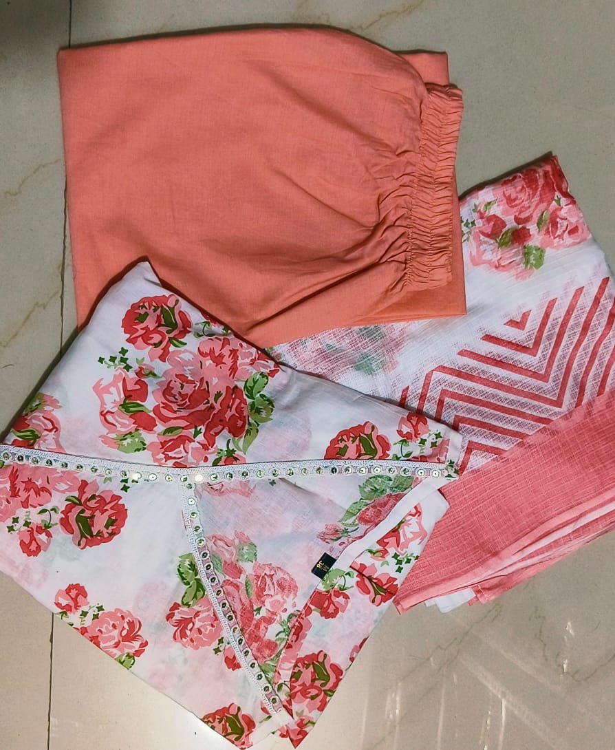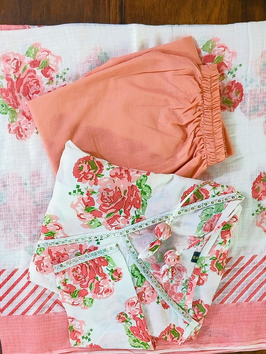 Bring freshness and charm to your ethnic wardrobe with this elegant 3-piece floral printed cotton kurti set. The beautiful pastel pink and white floral print combined with light and breathable fabric makes it ideal for daily wear, summer days, and light festive occasions.