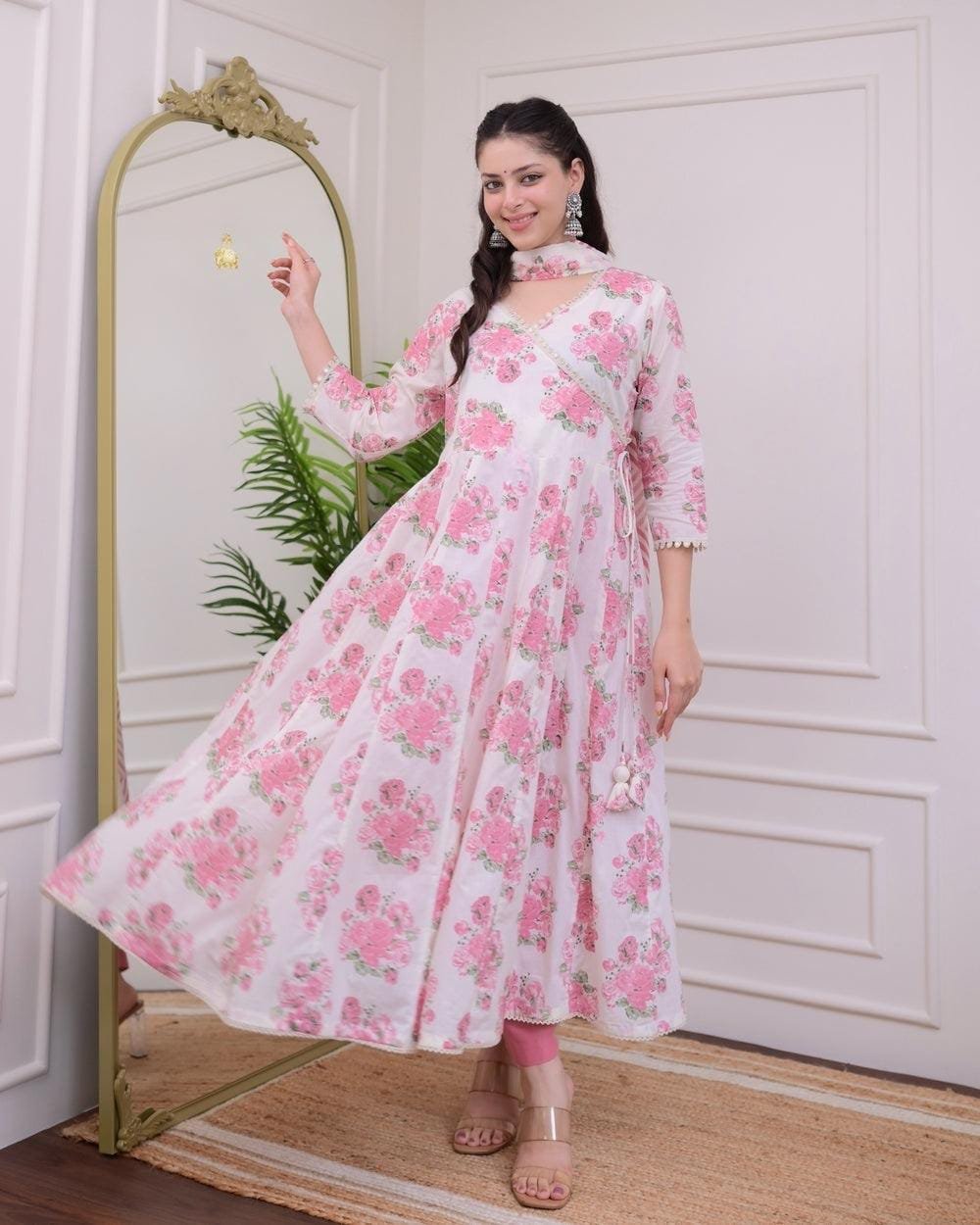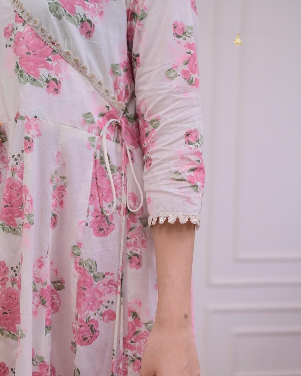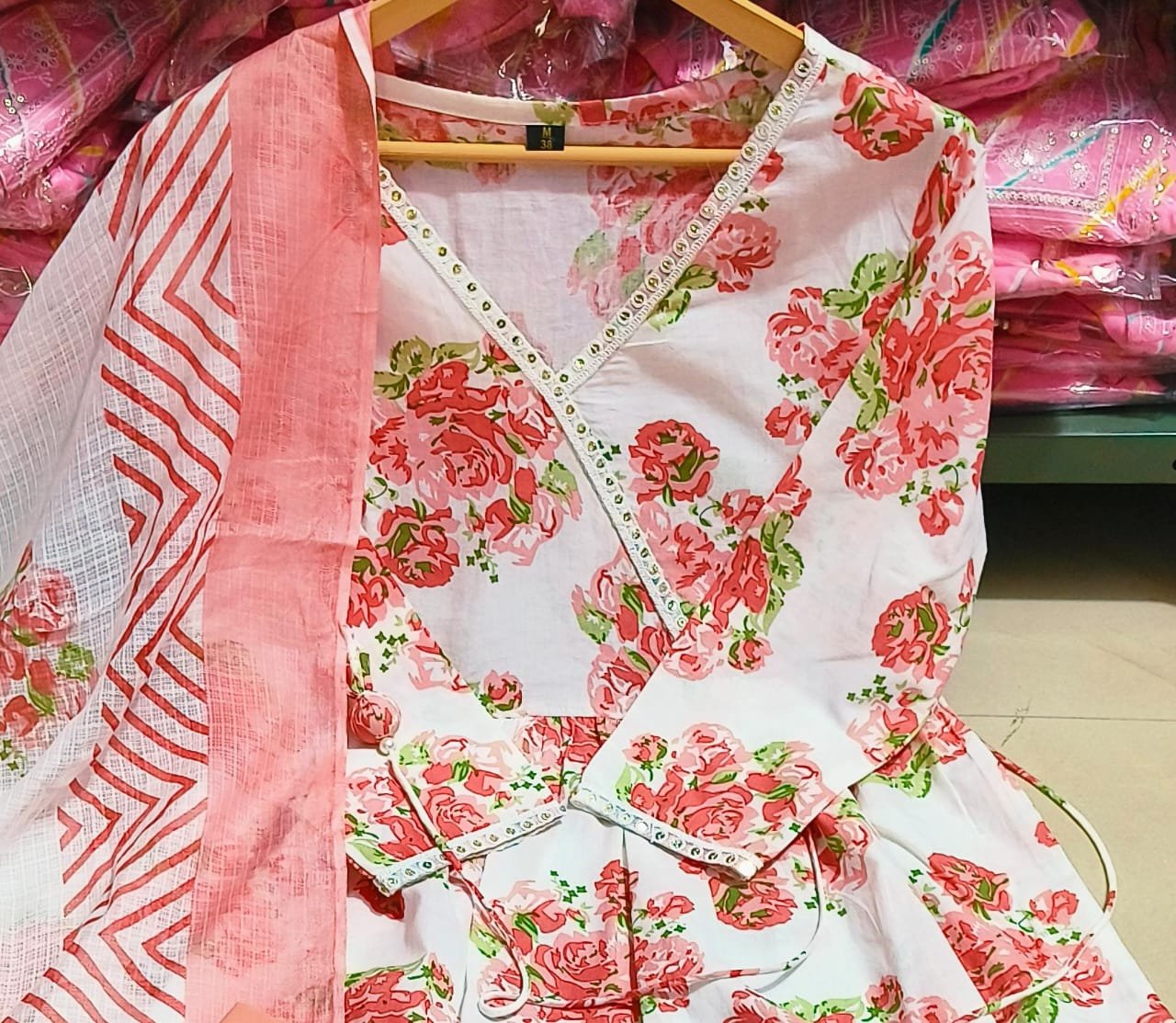 Bring freshness and charm to your ethnic wardrobe with this elegant 3-piece floral printed cotton kurti set. The beautiful pastel pink and white floral print combined with light and breathable fabric makes it ideal for daily wear, summer days, and light festive occasions.