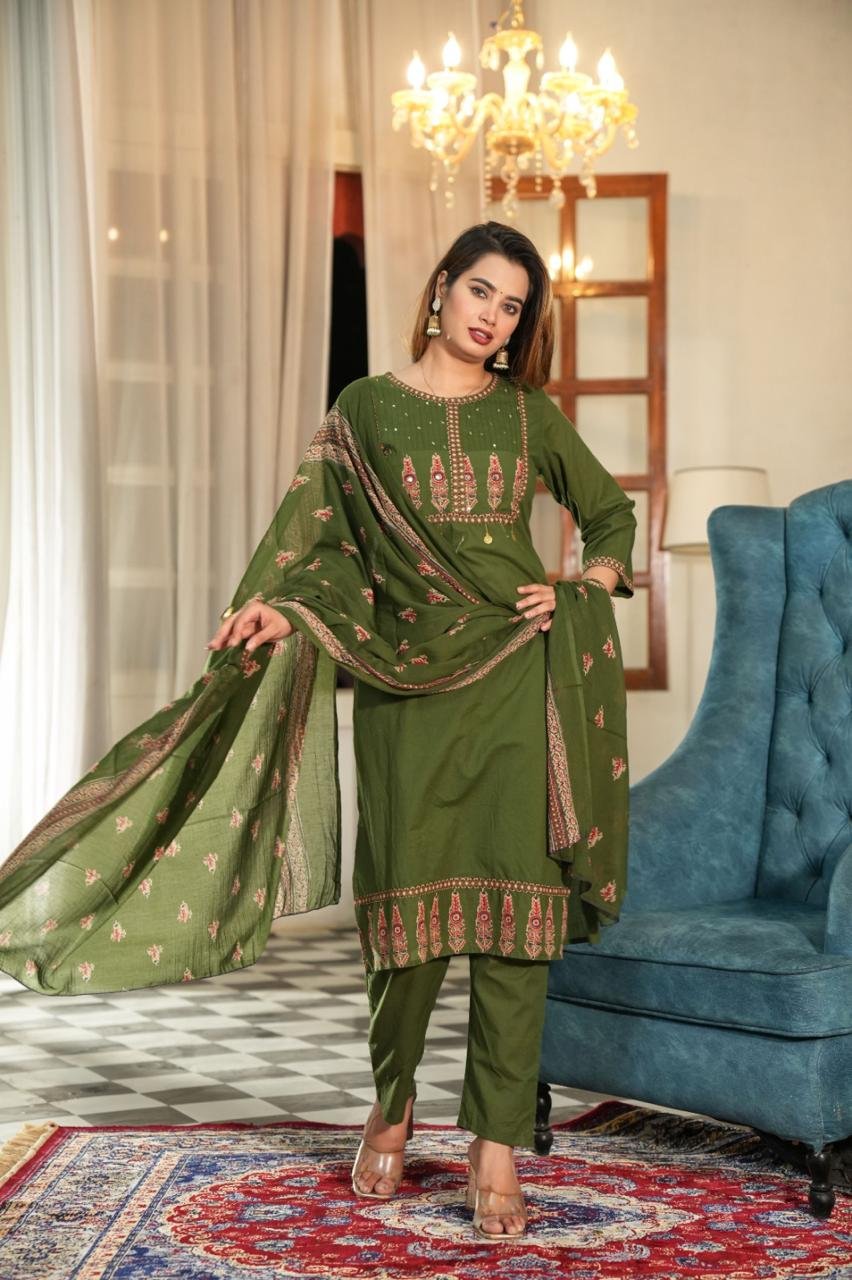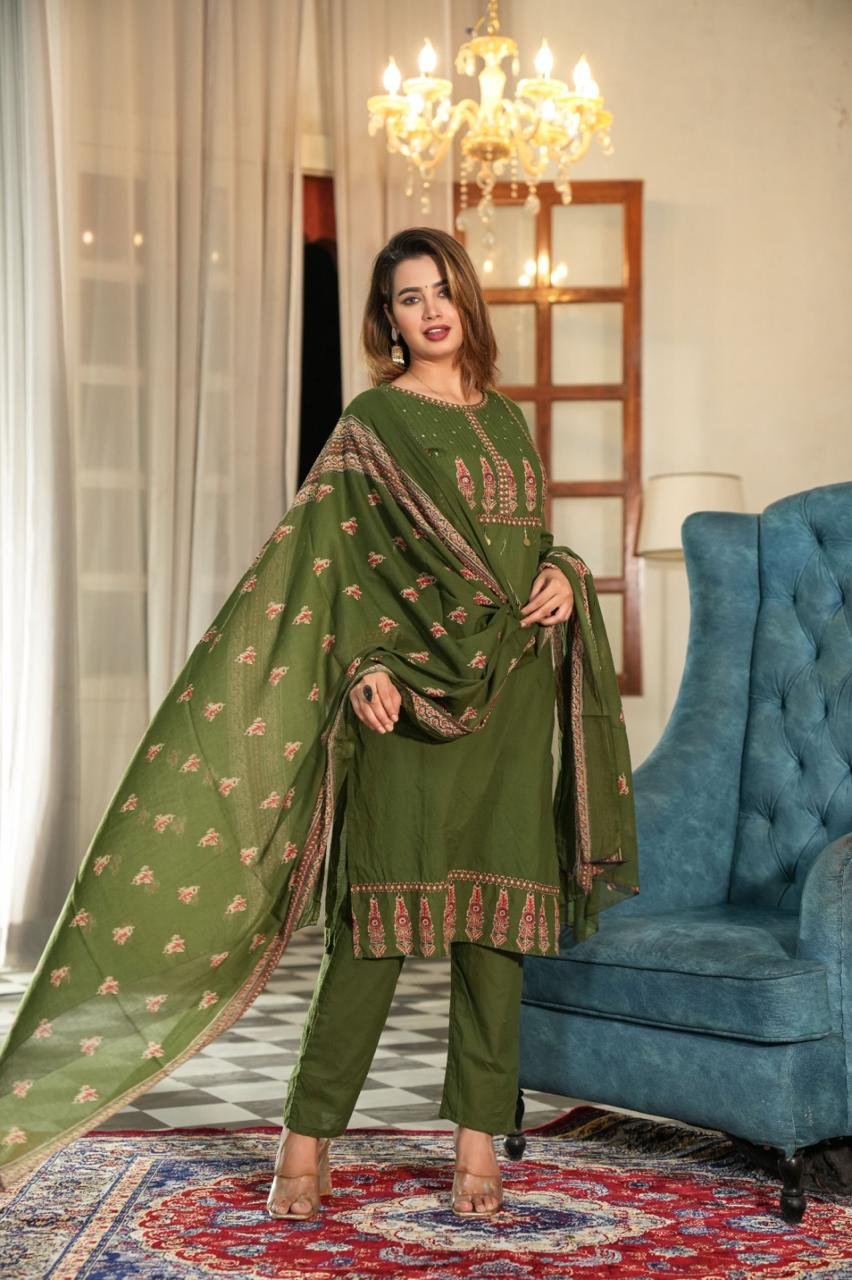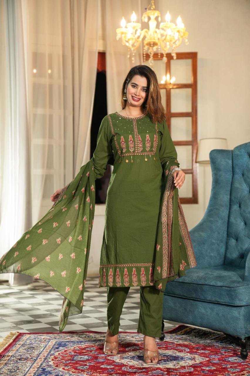 Stay effortlessly stylish in this olive green embroidered cotton suit set featuring a straight-cut kurta, matching pants, and a beautifully printed dupatta – perfect for festive and casual occasions